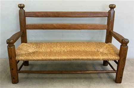 Panca rustica con montanti in legno e paglia intrecciata (cm 134x84x50) (difetti)