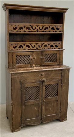 Mobile da dispensa in legno dolce con piattaia e sportelli con pannelli a listelli incrociati (cm 100x185x50) (difetti)
