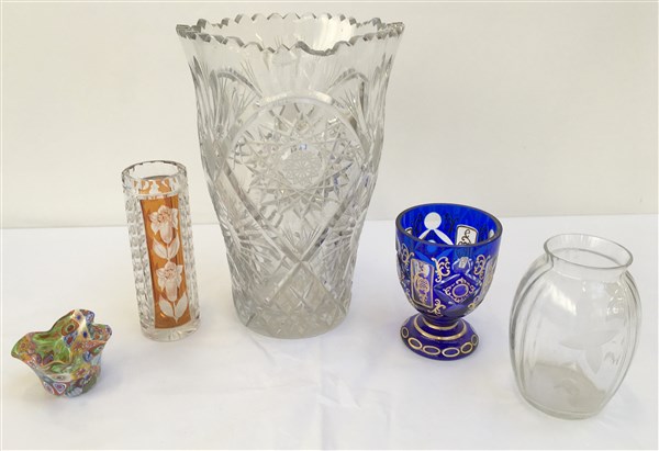 Manifatture diverse lotto composto da cinque tra vasi e calici in vetro e cristallo inciso