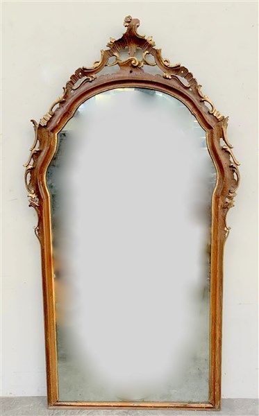 Antica specchiera "veneta" in legno con fregi dorati e traforati (cm 67x122) (difetti e mancanze)