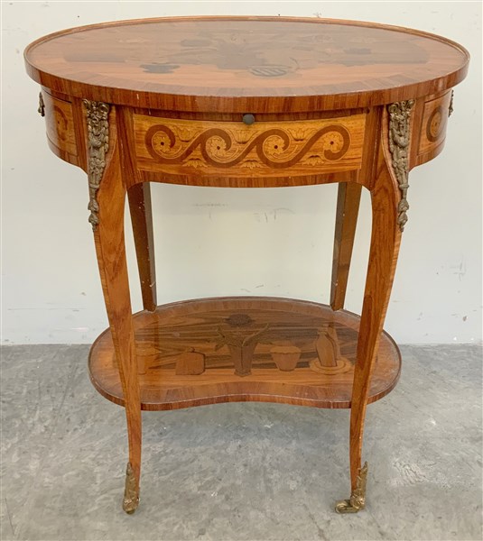 Tavolino di forma ovale a due cassetti con fascia intarsiata a frutti e fiori, ripiani decorati con composizione di bottiglie e vasi. Gambe munite di rotelle (cm 61x75x42) (difetti)