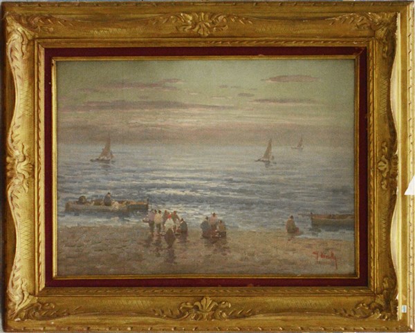 Firma indecifrata, "Marina con pescatori", olio su tela (cm 50x70) firmato in basso a destra, in cornice