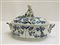 Manifattura del secolo XIX, zuppiera biansata decorata nei toni del blu con presa del coperchio con putti a tutto tondo e fiori in rilievo (difetti)