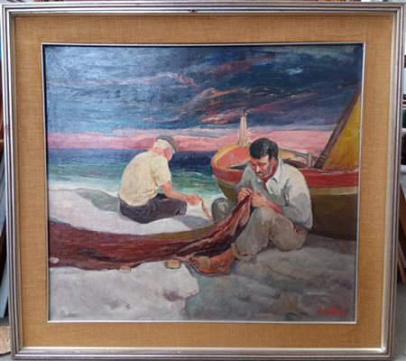 Ignoto "Pescatori" olio su tavola. Firmato E. Egitto 970 in basso a destra (cm 80x90) In cornice