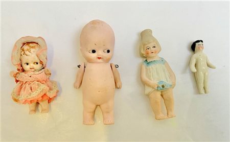 Gruppo di quattro piccole bambole in ceramica di cui una con abiti in tessuto (h max cm 10) (lievi difetti)