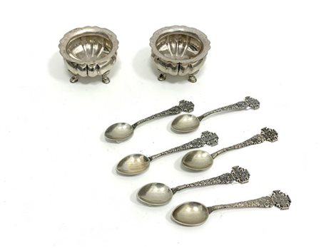 Lotto composto da due salierine e sei cucchiaini in argento con decori diversi