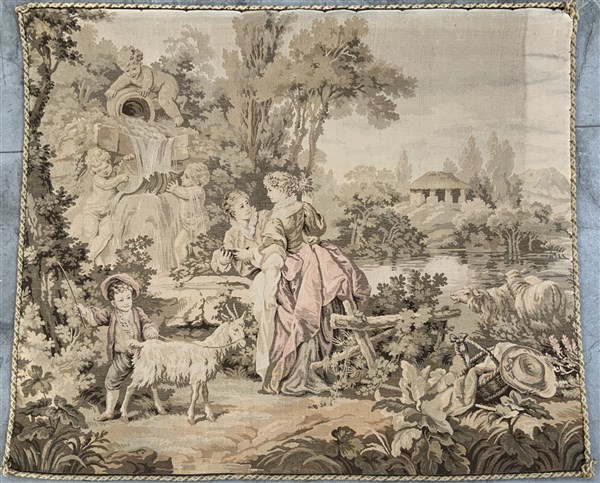 Arazzo meccanico, Italia, inizio secolo XX, raffigurante scena galante con putti, una cascata e un laghetto (cm 156x137) (Lievi difetti)