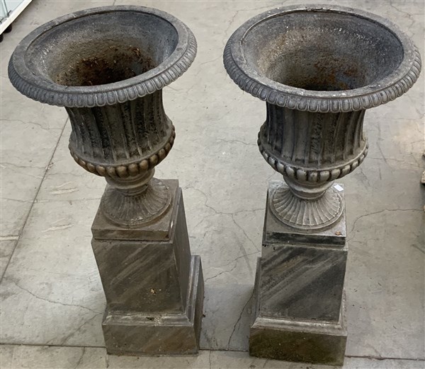 Coppia di vasi da giardino del tipo "mediceo" in ghisa verniciata con basamenti a colonna squadrata (h cm 94) (difetti)