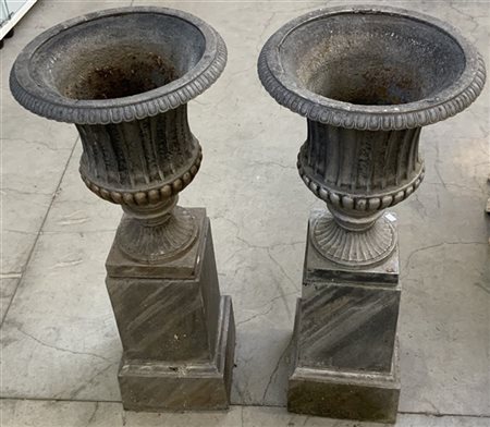 Coppia di vasi da giardino del tipo "mediceo" in ghisa verniciata con basamenti