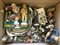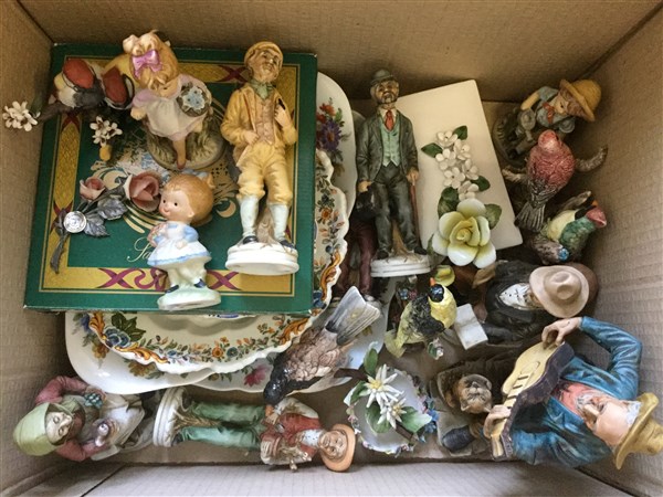 Cartone contenente alcuni piatti e numerose sculture in ceramica policroma di fatture e dimensioni differenti (difetti)