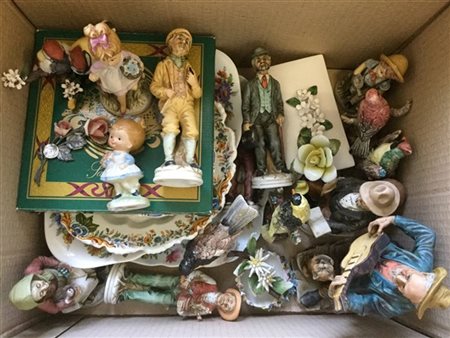 Cartone contenente alcuni piatti e numerose sculture in ceramica policroma di f