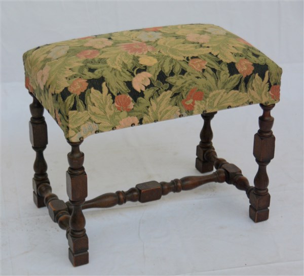 Panchetto con gambe a rocchetto riunite da traversa, seduta rivestita in tessuto operato a fiori (cm 37x52x60) (difetti)