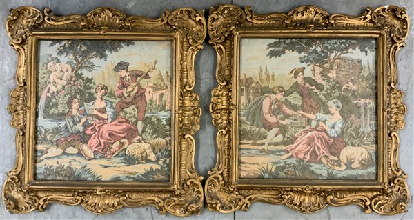 Coppia di arazzi meccanici in policromia raffiguranti scene galanti settecentes