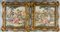 Coppia di arazzi meccanici in policromia raffiguranti scene galanti settecentesche in giardini con architetture in cornici. Italia sec. XX (cm 49x47) (difetti)
