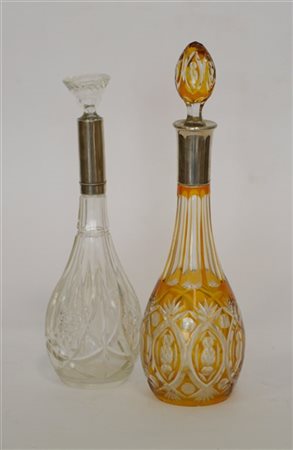 lotto composto da una botiglia con tappo in cristallo di Boemia color paglierino molato a motivi stilizzati, fine secolo XIX, unita ad una di simile decoro piu recente, misure diverse.