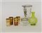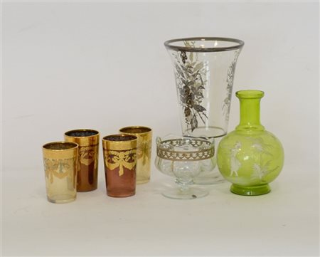 Lotto composto da due vasi in vetro decorati con figura in un paesaggio e fiori, quattro bicchieri decorati a dorature e una coppetta con ghiera in argento (difetti)
