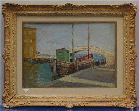 "Chioggia, peschereccio" olio su cartone (cm 25x34) firmato e datato '70 in basso al centro. Al retro: cartigliodel pittore. In cornice