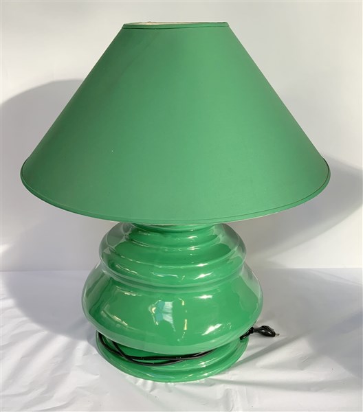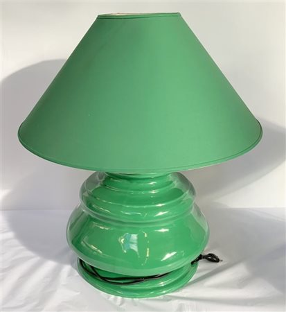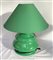 Coppia di lampade da tavolo a tre luci in gesso smaltato verde con paralumi in coordinato (h tot cm 62) (difetti)