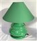 Coppia di lampade da tavolo a tre luci in gesso smaltato verde con paralumi in