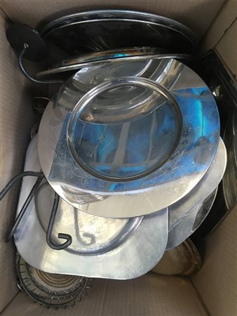 Cartone contenente numerosi oggetti in metallo argentato di diversa epoca e fattura (difetti)
