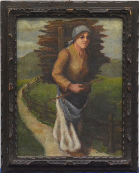 A. Bonomi "Contadina con legna" olio su compensato (cm 47x36) firmato in basso a sinistra, in cornice