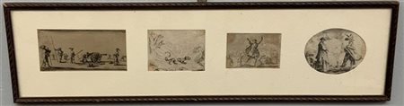 Gruppo di quattro incisioni di cui una di Della Bella, due di Callot e una di artista ignoto (cm 6x12; cm 6x8; cm 5,5x7,5; cm 6,5x8). In unica cornice