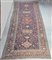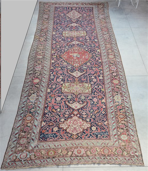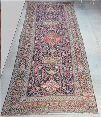 Decoro con medaglione lanceolato recante leone di Persia su fondo rosso che prosegue con forme lanceolate e cartigli a fondo verde salvia e bianco. Campo color blu notte cosparso di motivi floreali ed animali. Bordura Herati su fondo marrone. Datato e firmato in lingua araba ad una testata. (cm 612x200) (difetti, rapature e vecchi restauri)