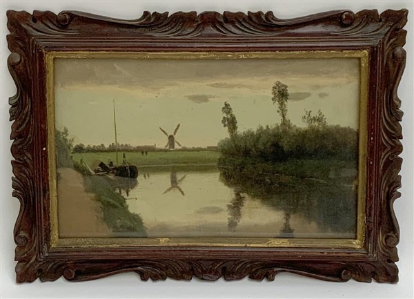 Ignoto "Paesaggio olandese" olio su carta applicata a cartone (cm 20.5x32.5) Reca firma incisa Formis in basso a sinistra. In cornice