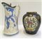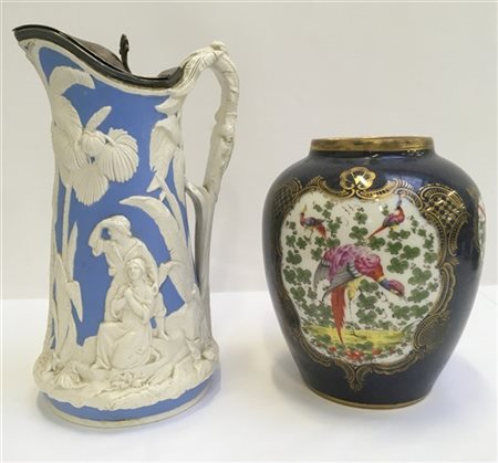 Lotto composto da un vaso della manifattura Samson in porcellana a riserve con decori naturalistici, e una caraffa in ceramica decorata a rilievo su fondo azzurro con coperchio in metallo argentato (difetti e restauri)