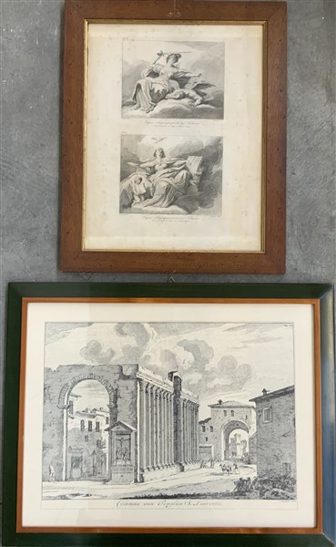 Lotto composto da un'acquaforte del sec. XVIII figure allegoriche da "Solimena" di Henriquez ed una riproduzione raffigurante le colonne di San Lorenzo a Milano, misure diverse, in cornice (difetti)