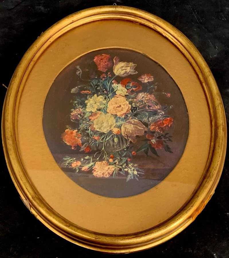 Lotto composto da una locandina di uno spettacolo teatrale degli anni '80 con Renato Rascel ed una riproduzione raffigurante dei fiori, misure diverse, in cornice (difetti)