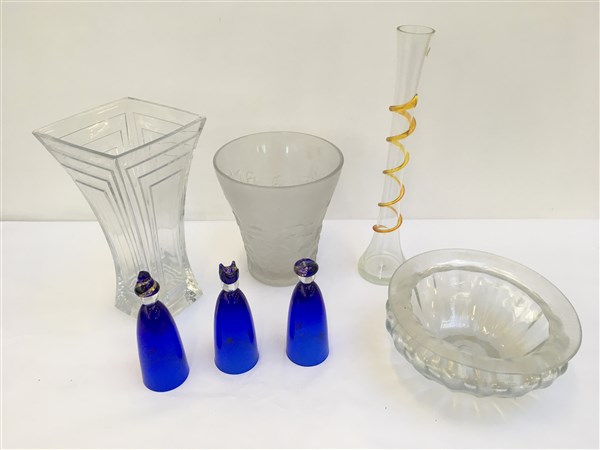 Lotto composto da tre vasi, una ciotola e tre sculture in vetro policromo di manifatture diverse