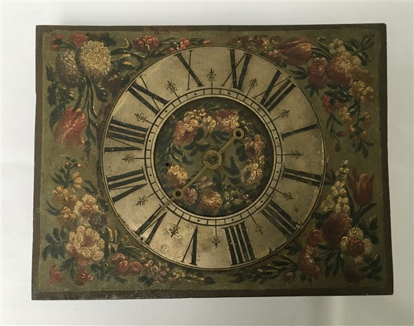 Mostra in lamiera dipinta a motivi floreali e quadrante a fascia in argento con cifre romane. (Sia la mostra che il quadrante sono di epoca posteriore al movimento)