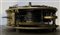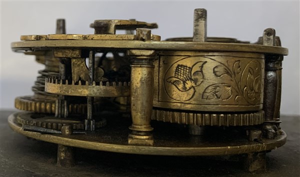 Movimento firmato di pregievole fattura in ottone dorato con retrocarica, scappamento a verga e suoneria delle ore tramite ruota partiore su campanello.