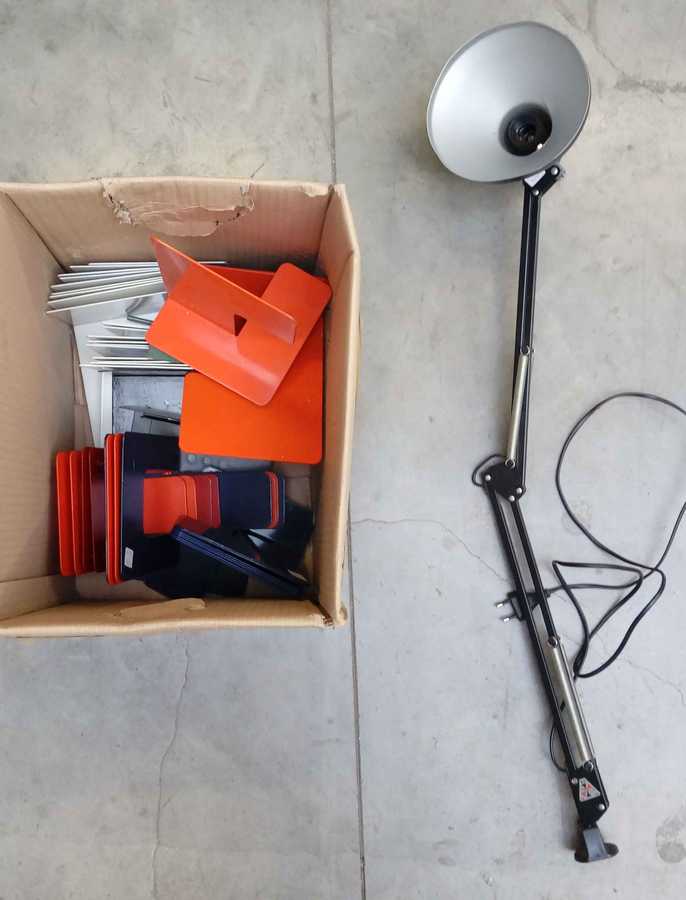 Lotto composto da una lampada da tavolo pieghevole in metallo laccato nero e un cartone contenente numerosi fermalibri in alluminio verniciato bianco, arancione e blu. (difetti)