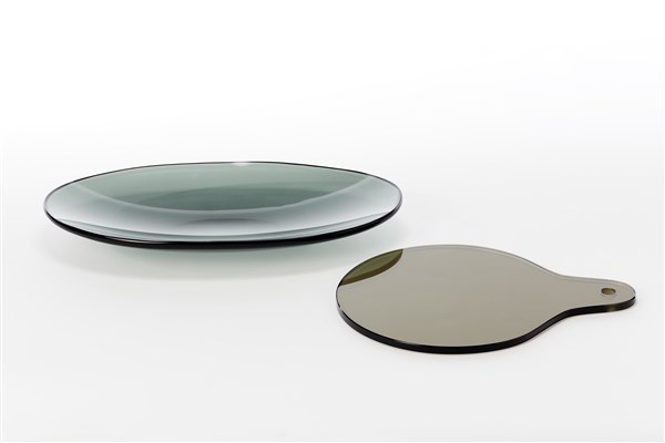 Lotto composto da un centrotavola e un soprammobile in cristallo fumè. Milano, anni '70. (cm 41,5x23,5; cm 25x32,5) (lievi difetti)