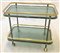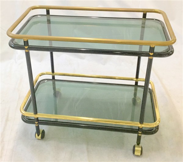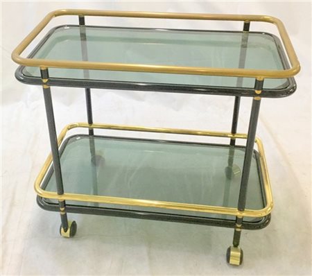 Carrello portavivande a due ripiani con struttura in metallo verniciato nero e ottone, ripiani in vetro fumé. Italia, anni '80. (cm 80x70x45) (lievi difetti)