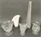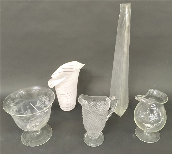 Vaso modello "Calla", in vetro soffiato incolore lattimo leggermente iridato, produzione Venini, Murano. Disegno n. 3861 del Catalogo Rosso Venini. Firmato all'acido sotto la base, unito a una coppa in vetro trasparente incolore inciso alla mola e decorato con motivi marinari, un vaso portafiori di forma triangolare in vetro trasparente incolore con inclusione di bolle e due brocche in vetro. Secolo XX. (misure diverse) (gravi difetti)