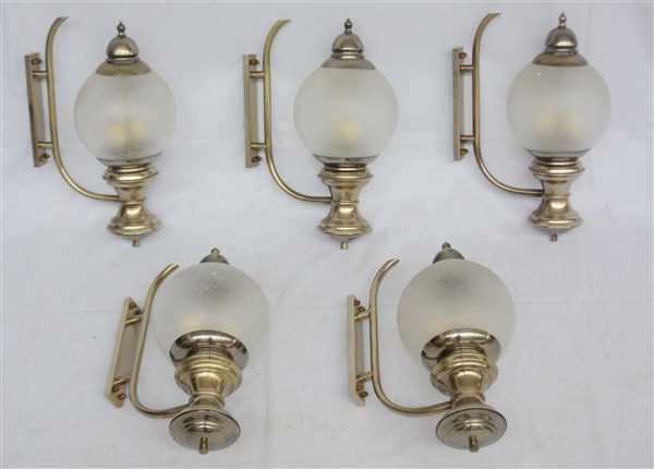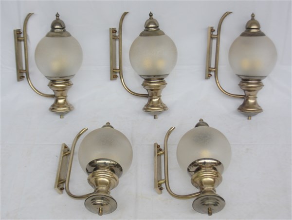 Lotto composto da dieci lampade da parete con struttura in metallo, paralume a sfera in vetro soffiato trasparente parzialmente acidato sulla superficie esterna. Italia, secolo XX. (cm 30x42x30) (lievi difetti)