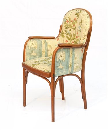 Poltroncina in faggio curvato al vapore, stampigliata nella fascia interna. Vienna, 1913. Marcata a fuoco sotto la seda "J.J. KOHN 19 1 VIII 13 WIEN AUSTRIA" sotto la base. (cm 58x93x50) (lievi difetti)