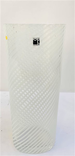 Vaso in vetro soffiato trasparente incolore con filigrana lattimo. Italia, anni '80. Recante etichetta adesiva. (h cm 32)