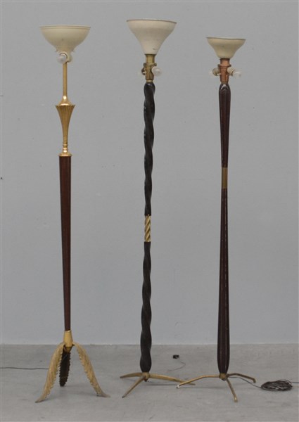 Lotto composto da tre lampade da terra con fusto in legno e ottone, base in ottone. Italia, anni '40/'50. (h max cm 180) (lievi difetti)