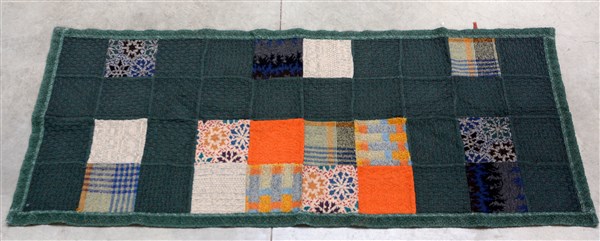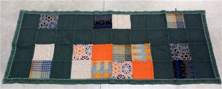 Arazzo patchwork confezionato con frammenti di tessuti Missoni, bordato in tessuto goffrato. Italia, 1986. Firmato e numerato al retro con numeri romani. Etichetta Missoni ad un lato. (cm 209x91)