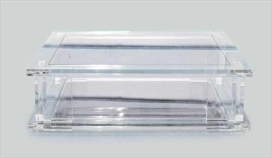 Tavolo basso di forma quadrata con struttura in plexiglass trasparente, piano i