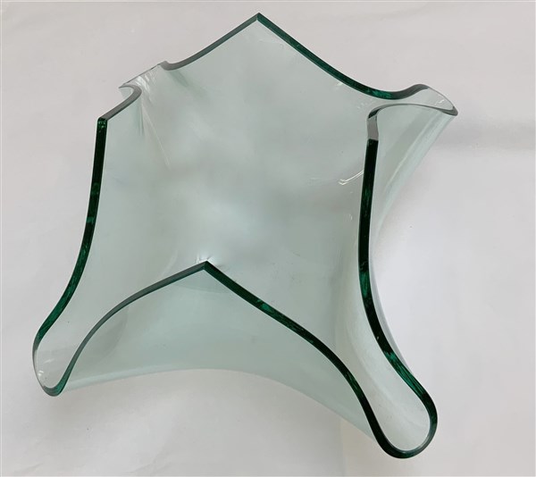 Vaso a fazzoletto con base quadrangolare. Milano, anni '90. Vetro trasparente incolore. (h cm 28,5; d cm 45) (difetti)