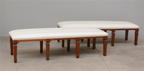 Lotto composto da due panche con struttura in legno massello, seduta imbottita e rivestita in finta pelle bianca. Italia, prima metà secolo XX. (cm 171x48x55) (lievi difetti e restauri)