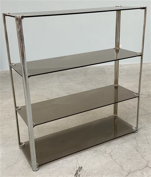 Libreria a giorno con montanti in metallo cromato e quattro ripiani in vetro fumé. Italia, anni '70. (cm 101x108,5x36) (difetti)
