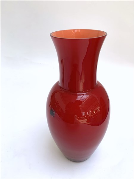 Vaso a balaustro in vetro incamiciato rosso. Italia, anni '80. Firmato a punta alla base e recante etichetta adesiva. (h cm 30) (lievi difetti)