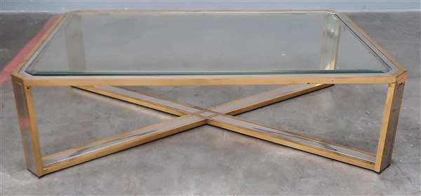 Tavolino da salotto rettangolare con struttura in ottone e metallo cromato, piano in cristallo. Italia, anni '70. (lievi difetti)