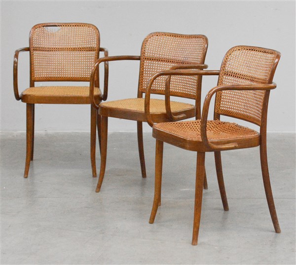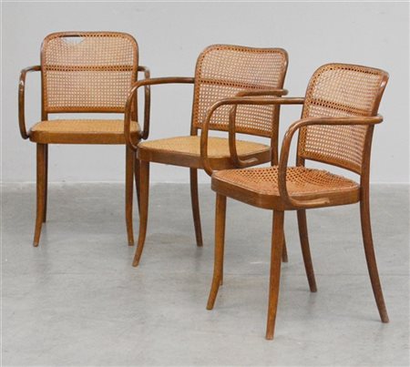 Lotto composto da tre poltroncine in faggio curvato al vapore con seduta in paglia di Vienna. Cecoslovacchia, secolo XX. Marcate a fuoco sulla struttura. (cm 49x80x46) (difetti)